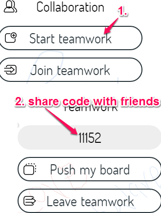 To work together with your friends and to save your board, you need to login using the button available at top left side. After login, click on People icon available at right side on your board and tap on Start teamwork button. It will generate a unique code that you can give to your friends.
