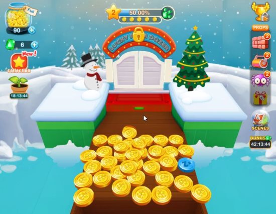 The graphics of the game are pretty awesome as you can see. Now in the screenshot above the red colored bar is moving forward and backward pushing coins forward. New coins can be dropped by clicking in the empty space just in front of the moving bar. This will help in pushing the coins. From time to time there will be boosters, collectible items that will be dropped on the belt as well. Collecting these can help you score more coins, get power ups, etc.