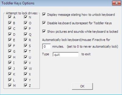 Toddler keys is another free keyboard locking software which allows you to easily lock keyboard, mouse, CD drives, and power off button of your PC. This free keyboard locking software is capable and efficient enough to work automatically when your computer is left idle, as it locks keyboard, mouse etc. automatically if the computer is idle for a specified time. You can even add sounds and images to it, so whenever a key is pressed on your keyboard, it plays the sound and displays the images for entertaining your kids. For unlocking, you need to simply type “QUIT” using the keyboard.