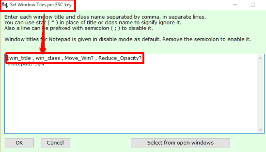 Click that button and another window will open. That window contains a box in which you can add fields to make a window move aside automatically or become transparent. You need to add the title, class name, ‘Y’ (to make window move aside), and ‘N’ (to don’t make the window transparent). Your command would be like: window name,*,Y,N.
