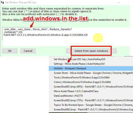 For example, if you have to automatically move an image editor, like Paint.NET, you need to enter: “Paint.NET,*,Y,N“. After this, save changes, and that window will move aside automatically. To make the window become transparent, your command would be: “Paint.NET,*,N,Y“.