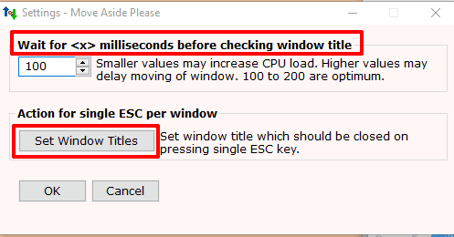 Setting window lets you set the delay time (in milliseconds) to move a window aside. The window also provides a Set Window Titles button.