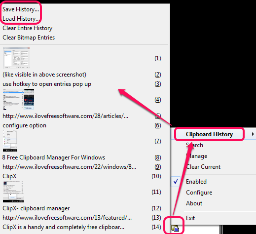 - You can save clipboard history to PC in form of its native file format (*.clx). Later on, you can load the same history when required. Right click on its tray icon and use Clipboard history option to save and load history.