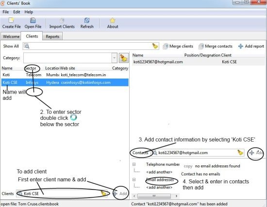 The clients details can be entered easily as shown in the above screenshot, simply enter in the client name and click the add button in order to add the name. Then double-click below the sector to add client’s sector. Now add contact information by selecting the client. Then enter in the contact information and click Add button to add them.