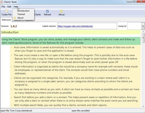 Clients’ Book offers very good information about itself in the ‘Help’ option. Help provides ‘Introduction’ which is about the software and the ‘Tutorial’ which will guide you to start using application to add clients details and more. ‘Welcome’ and ‘Help’ both are almost same. ‘Clients’ option will let you create file, enter details of clients, merge clients or contact, add reports, and more.