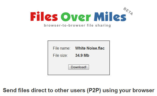 FilesOverMiles is a free web service where users can send files to each other directly without uploading to a middleman first. Normally when someone shares files via free file hosts, they are first uploaded to the file host, links are generated which you then give to the person to which the files have to be sent, and then they are downloaded. FilesOverMiles will connect you and the person who needs to receive your files directly, files will not be uploaded to FilesOverMiles at all.