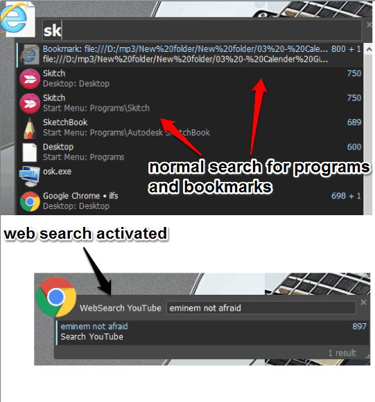 Below you can see its launch box with normal search and web search.