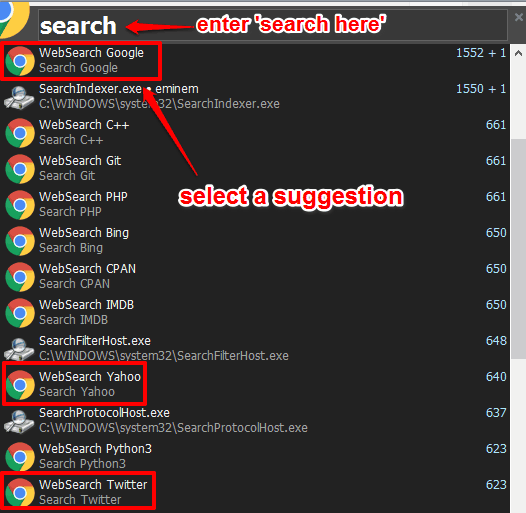 If you want to search for a particular content using a specific search engine or need to search a term on Wikipedia, YouTube, Twitter, etc., you can type ‘search‘ in the launch box. After this, it will show suggestions: WebSearch Google, Yahoo, Bing, IMDB, WebSearch YouTube, Wikipedia etc.