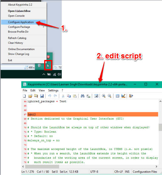 Apart from these special features, this application launcher also lets you configure the application. That means you can exclude/include bookmarks, Start Menu, or other items in the search suggestions. However, customizing the configuration is not so easy. You need to add changes to a script and then replace the original script with the new script. Right-click on the system tray of this software to access Configure Application option, which opens the script and edit it.