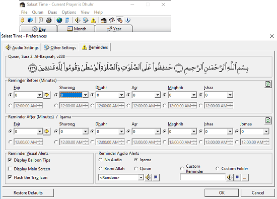 Salaat Time is a very nice software to keep track of prayer times while working. You can let it run in the background and even use it to hear some random Quran verses as well. The software has some verses from popular chapters of Quran like The Cow, The Blood Clot, The Ants, The House of Imran, Women, Assistance, Time, etc.
