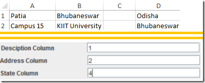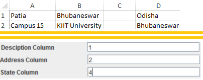 You have to fill the three text fields with the column number from the excel spreadsheet where the address are written. For example: In the excel sheet you add description of the place in column A, then in the ‘Description column’ of the application you will mention 1. If you add address in column B then in the ‘Address Column’ of the application you will mention 2. Similarly, you would do for the State column. An example is given below: