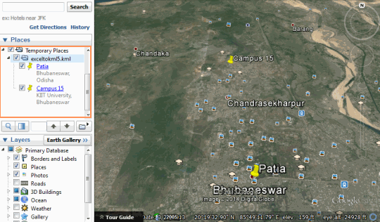 Now open up Google Earth, go to the ‘Open’ under the ‘File’ tab and select the .kml file just created. Now you will see your filename under ‘Temporary Places’ and along with it the locations inside it will also be listed.