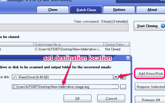 Step 4: Repeat 2nd and 3rd step to enter another drive. You can select different destination locations for creating the images of drives.