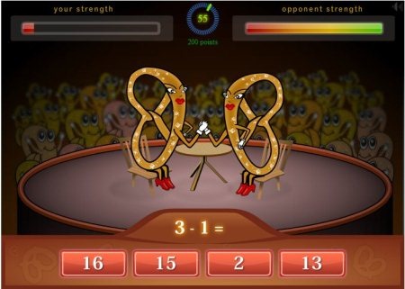 Pretzel arm wrestling is one of the first grade online math game in which you need to choose the correct answer for math addition and subtraction problems displayed on the screen, your correct answers will let you win in this arm wrestling.