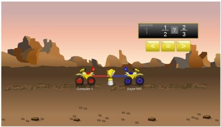 Dirt bike fractions is one of the fourth grade online math game in which there is tug war between the dirt bikes. And you need to select the correct sign to state that whether the fraction is smaller than, bigger than or equal to the opposite fraction displayed on the screen to win this game.