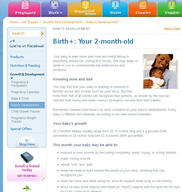 By clicking on the Baby’s Development option in the menu on the left, you’ll be able to access information on what your kid should be doing when it’s for example a few months old, which can be seen in the image above. At the top you’ll have quick access to various different stages of development, from pregnancy all the way to toddler.