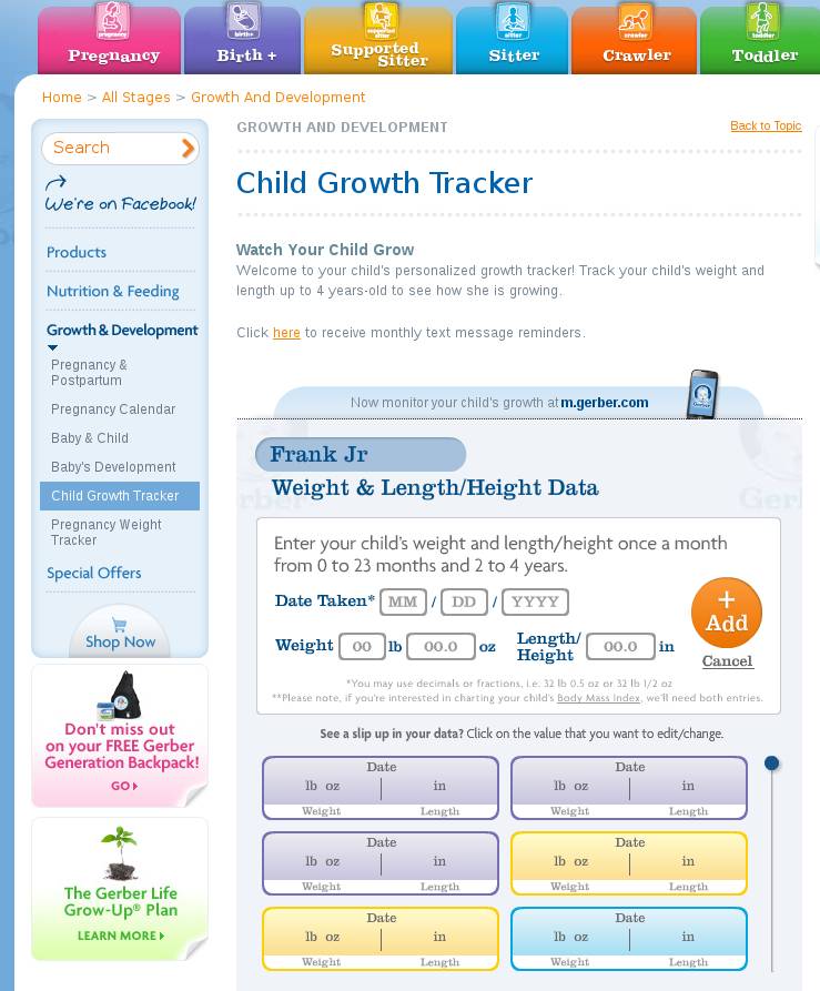 Once that you’ve registered and logged in, you are immediately gonna be presented with the weight and height tracker and calculator, which can be seen in the image above. Here, you will have to enter the weight and the height of your baby once a month, and you’ll be able to see the progress of you child. Enter in the numbers and click Add to enter data.