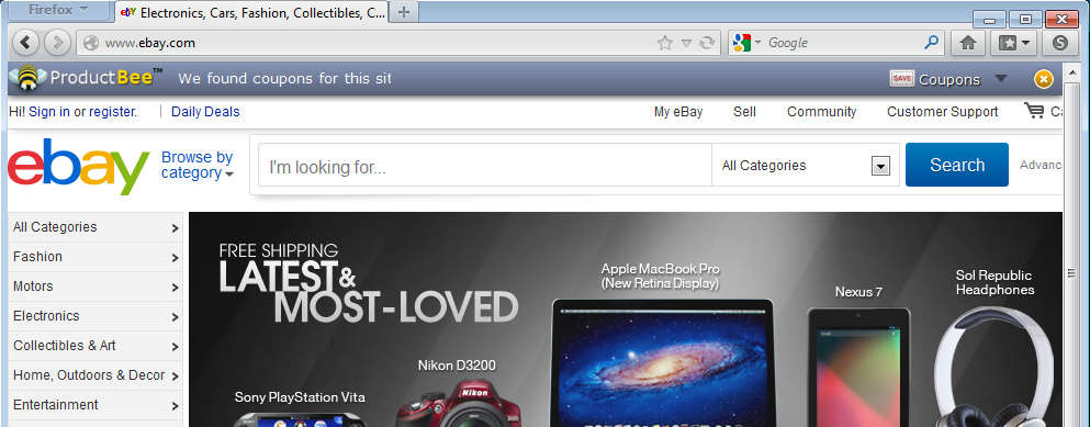 What you see on the image above is the ProductBee price comparison toolbar working on eBay. It’s gonna work the same way on every other online shopping website that you visit. If you open up the home page of any of the major shopping website, you’re only gonna receive coupon suggestions. Actually product price comparison and search for sellers with cheaper prices takes place when you start browsing products.