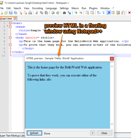 Preview HTML Notepad++ plugin will definitely save a lot of time of yours, which otherwise is wasted to save the file again and again and open the HTML file in a browser to see the output.