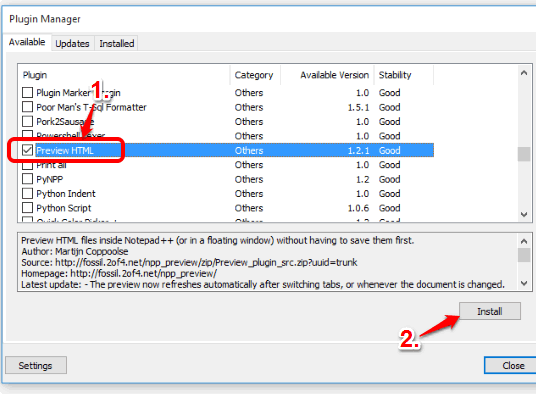 Step 2: In Available tab, the list of Notepad++ plugins will visible. Find “Preview HTML” plugin.