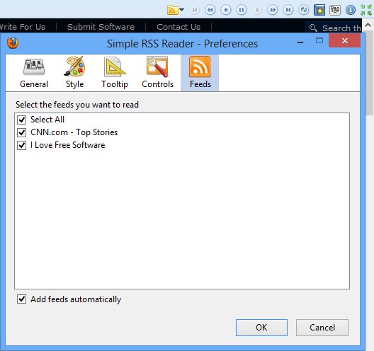 Clicking on the gears icon from the right side of the toolbar allows you to change various different options of this free RSS Firefox addon. The most interesting option to tweak would be the Feeds tab, where you can select which feeds will be shown in the toolbar.