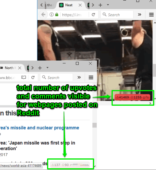 Reddit does support feature to show upvotes and comments for all webpages visible in feed. But, when you open a webpage, stats are not visible. Therefore, this Firefox add-on is handy. Whenever you open some external link posted on Reddit (be it some article, image, GIF, etc.), it shows the total number of upvotes and comments for that particular webpage.