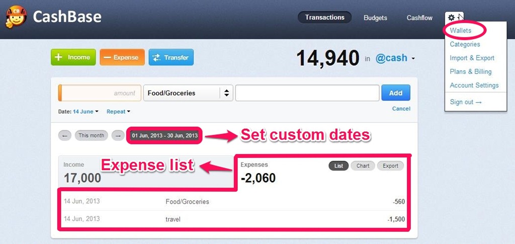 You can set the date range just by clicking on the custom dates. CashBase allows you to track money that is being transferred to another wallet/account. You can add a name to your wallet so that you can know where your money has gone or come from.