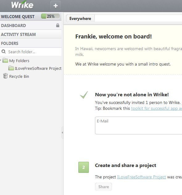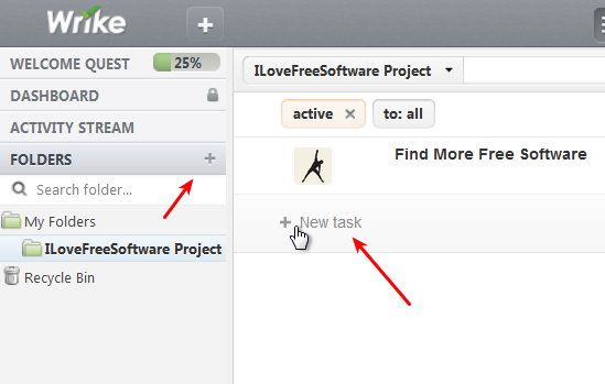 To use Wrike, you first have to register an account. For the time being they are offering free trials of premium memberships which give you extra storage, more users can be registered as project managers, projects can have unlimited number of children (as in hierarchy) and various other more advanced features.