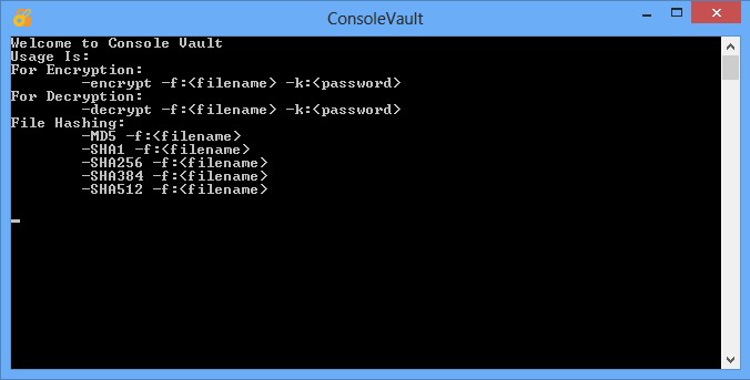 Command Vault can also calculate various different file hashes, like for example MD5 or SHA. This command line file encryption software is easy to use, and all the commands that are required are neatly displayed on the interface as soon as you start the program.