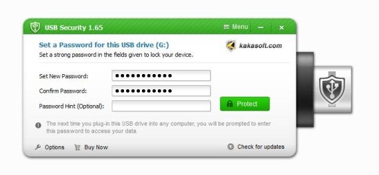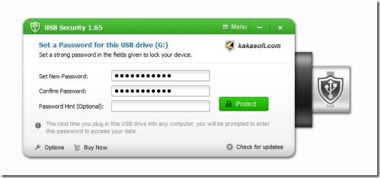 So, when you finish downloading just connect the USB drive which you want to encrypt, before running the program. Kakasoft USB Security software will automatically detect all the portable devices connected to your computer and ask you to choose any one of them. You can choose the desired drive to lock. Then, you need to enter a secret password, confirm it, and click on the “Protect” button to lock USB drive. After your USB gets locked, you will see nothing but a “USBSecurity.exe” file inside it. To get the data back, you need to unlock your USB drive.