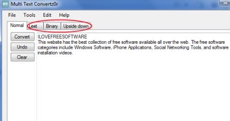 Multi Text Convertz0r is a free text converter that lets you easily convert the text between normal, binary, upside down etc. You simply need to copy paste the text which you want to convert and perform actions according to your preference. This text converter tool also lets you cut, copy or select the desired text (normal, binary etc.) from the available text file. It is a really simple tool and you just need to perform actions using a single click of mouse.