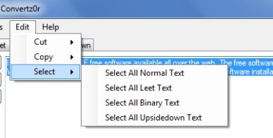 You can also cut, copy, or select the normal text, binary text, Upside down and leet text via available options. For this, you need to click on available Edit option. And then, you will find cut, copy, and select options. Perform these actions according to your suitability.