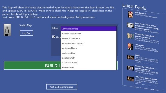 The user interface does all right, it’s simple and quite basic. The moment you open Facebook LIVE TILE, the app asks you to connect with your Facebook credentials. One important thing to remember while doing so (connecting to Facebook), is to Check-on the Keep Me Logged In To Live Tile – Win 8 option, present just below the Password text field. After logging, you’ll get the only screen of the app. Here, you’ll find the instructions of building Live Tile and a little description about the app. You can choose the desired filter from the Filter drop down list, and click on BUILD LIVE TILE Button.