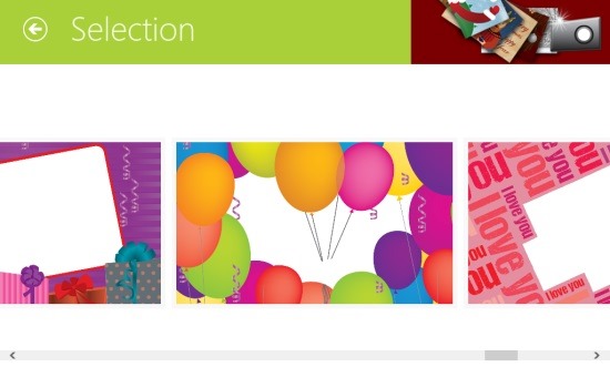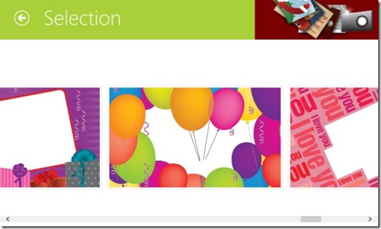 You can get free Greeting Cards Studio from Windows store or by clicking on the link given at the end of this review. After launching the app, you will find different categories of frames on the home screen. The different provided categories are: Selection, Merry Christmas, I Love You, Mother’s day, Halloween, Imported Frames, etc.. Under each category, you will see frames available for that category. You can scroll toward Right to see more categories.
