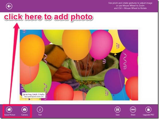 Greeting Cards Studio is a free greeting card maker app for Windows 8 which lets you to Create your custom greeting cards for every occasion. This app provides a wide range of frames for different occasions like: Birthdays, New Year, Mother’s day, Halloween, Merry Christmas, etc.. It also lets you to insert your own frame either from your local system or directly from the web. You can insert any photo in the frame. It provides two option to insert a photo: choose from your local system, or capture one from camera. You can also adjust the inserted photo by zooming and rotating the image.