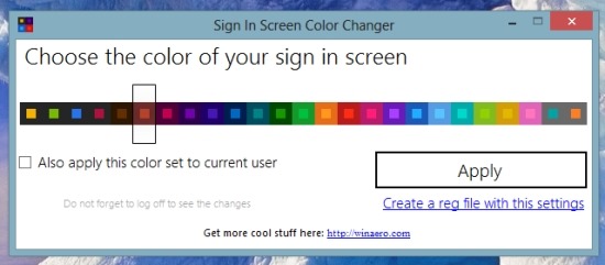 - Now that you have figured out which file you are going to run, just double click on it to run it. Now you will be presented with the interface as shown in the first screenshot of this post. Just click on any color of your liking. Now all you are supposed to do is click on the Apply button. Also if you would like to set this color as the sign screen color of the current user then put a check on the checkbox which says “Also apply this color set to current user”.