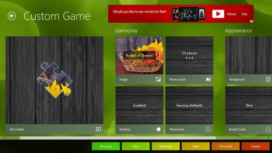 While solving a puzzle, by default the rotation of the pieces are disabled. But you can also enable them, and make the game more interesting. This option for rotating the pieces is available under the Custom Game category. Simply click on the Custom Game button in the Home screen of the game app; using this method you are actually creating a custom game of your desired type with the image and the game mode of your choice, plus, with the rotation enabled. you can also choose to play with pieces of different sizes and set the pieces border thickness.