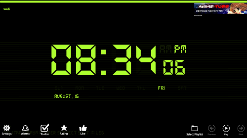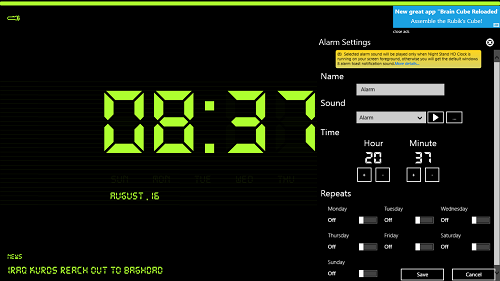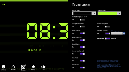 Digital Nightstand is a free Windows 8 clock app. The main feature of this app is that it offers a clean interface that is very soothing to the eye to look at, and hence, it serves as a perfect night stand clock app for Windows 8. The app also showcases news feed that keeps flying across at the bottom. Apart from that, it also has an option to use your screen as a flashlight.