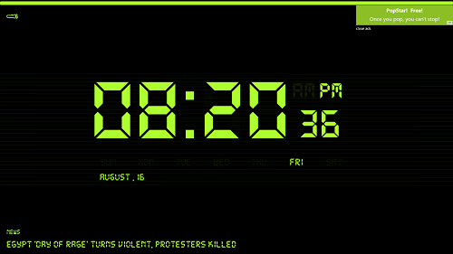 In the above screenshot, you will be able to see that a large sized clock will be presented on your screen in a full screen mode. You can see the seconds ticking away, the AM/PM display, the date, and also, you will be able to see the news headlines flashing at the bottom of the screen.