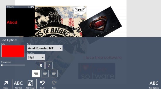 The app lets you make the pages as beautiful as you can, you can write text with fancy fonts and color, and then add images. Simply, click on Add Image button, to add images stored locally in Windows 8 devices or, even from SkyDrive. Moving, scaling, and rotating images is very easy. Simply, select desired photo, and you get the required buttons. Besides these, you can also draw freely in the pages, using the Draw tool. It comes under the Mode button on the bottom ribbon. The pen strokes are clean, smooth, and continuous. You can change brush color, transparency, and size by clicking on Pen options button. Good thing is, the app remembers the last 5 used pen and their settings, so that you can quickly use them again. Now, this is a pretty good option, if you like to draw.