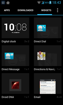- The Widgets menu will contain all the Widgets that are available for display on the homescreen of your device. It houses all of the widgets, and you can add a widget on the homescreen by long pressing on a widget and dragging and positioning it on the homescreen. The Widgets menu can be accessed by clicking the WIDGETS button, and it looks like the following screenshot.