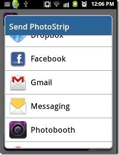 You can share the created photo strip via Facebook, Twitter, Gmail, Messages, Bluetooth and many more.