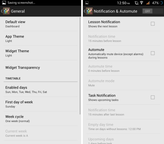 In the general section you get the options to choose the default view, app, and widget theme, timetable settings, and more. In notification & automute you can enable notifications for lessons, tasks, and exam also the app allows you to automatically set your phone to silent or vibrate when its class time. This feature is really helpful.