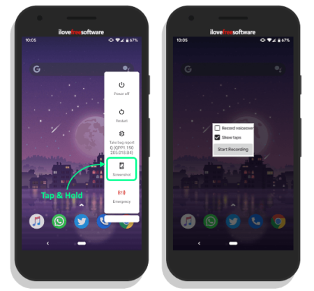 To use the native screen recorder to record the screen, tap and hold the screenshot button. This opens an overlay on the screen with a Start Recording button. The button is accompanied by two options feature to show the taps and record voiceover while screen recording.