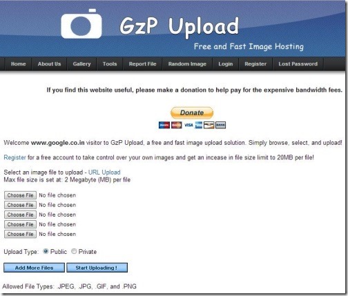 This free image hosting website allows you to upload images from your PC, and at the same time provides you URL Upload option, which you can use to upload images directly to the server. It provides you with five image upload boxes, but at the same time allows you to add more boxes, to effortlessly bulk upload images. Soon after uploading images, it redirects you to the page where it displays respective links to images, which you can use on various websites or blogs.