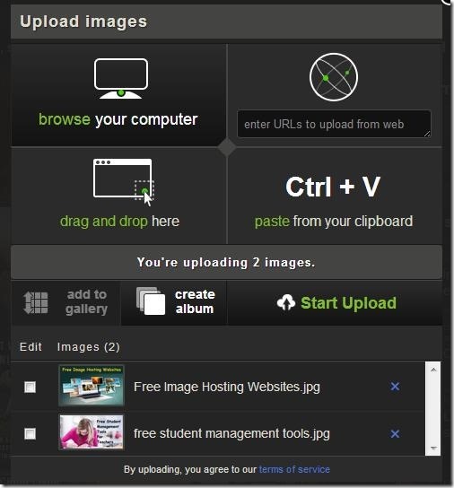 USE is another free image hosting website that lets you upload hundreds of file in one go. It lets you upload multiple photos using your computer or via web URL. At the same time, it provides you an option to upload video. To upload multiple images simultaneously, you can try Bulk Image Uploader option.This free website lets you upload the entire set of photos, or alternatively you can opt to upload any specific image. It allows you to add title, categories, text & tags, while uploading the image. This free image hosting website lets you auto-post images on various social networks, like: Twitter, Facebook, and Tumblr, so as to share you photos in one go.
