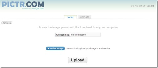This free image hosting website provides you two tabs, namely: Local and Remote. “Local” tab allows you to upload images from your PC, whereas “Remote” tab enables you to enter an image URL, so as to upload images directly to the server. It uploads image in default size, whose width can be resized manually, if required. Soon after uploading the image, it generates different URLs of the images. Not only that, this free image hosting website lets you share your image on various social networks like Facebook, Tumblr, Twitter, etc.
