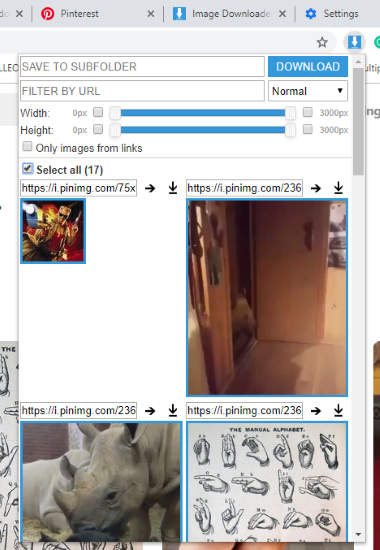 Install the extension, access Pinterest board, and use the extension icon. It will open a new tab where you will see the images of that particular board. For each image, it will show the image resolution which is a unique feature. Now you can select images to save them to PC or also filter images by regex or image resolution to download the images based on the filter.