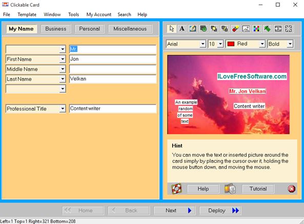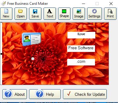 For starters it lets you use images as background and also import additional images (logos for example). Business card information like person name, company name, address, email, website, phone, etc. is added using text boxes on the left half of the application window. Input boxes are actually grouped into 4 categories, “My Name”, “Business”, “Personal” and “Miscellaneous”. Text from each input box is added to its default location on the business card layout to the right. Don’t worry, it can be repositioned manually using the mouse. Finished cards can be printed in any size, the only limitation being the paper size. Alternatively you can export finished business card as JPEG, PNG and GIF.