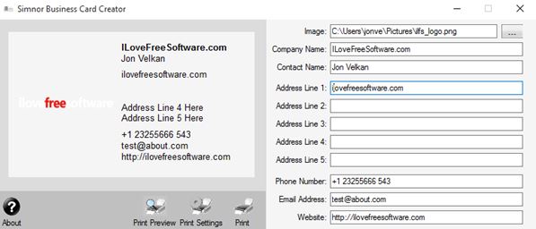 With Simnor Business Card Creator you don’t get any kind of templates, but what’s more interesting is that there is also no toolbox of any kind. I shouldn’t say that there aren’t any templates, because you do get one. It’s a plain white business card template, see image above. As far as tweaking goes, you get input boxes on the right, There you can add logo, company name, contact name, up to 5 address lines, phone number, email address and lastly a website link. Up to 6 business card can be printed per sheet of paper.